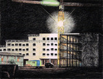 2007Opgenomen in de collectie van het Stadsarchief Amsterdam. Het in aanbouw zijnde Stadsdeelkantoor Amsterdam Oost-Watergraafsmeer tijdens het 'Polderlicht' festival. Houtskool conté en kleurpotlood.